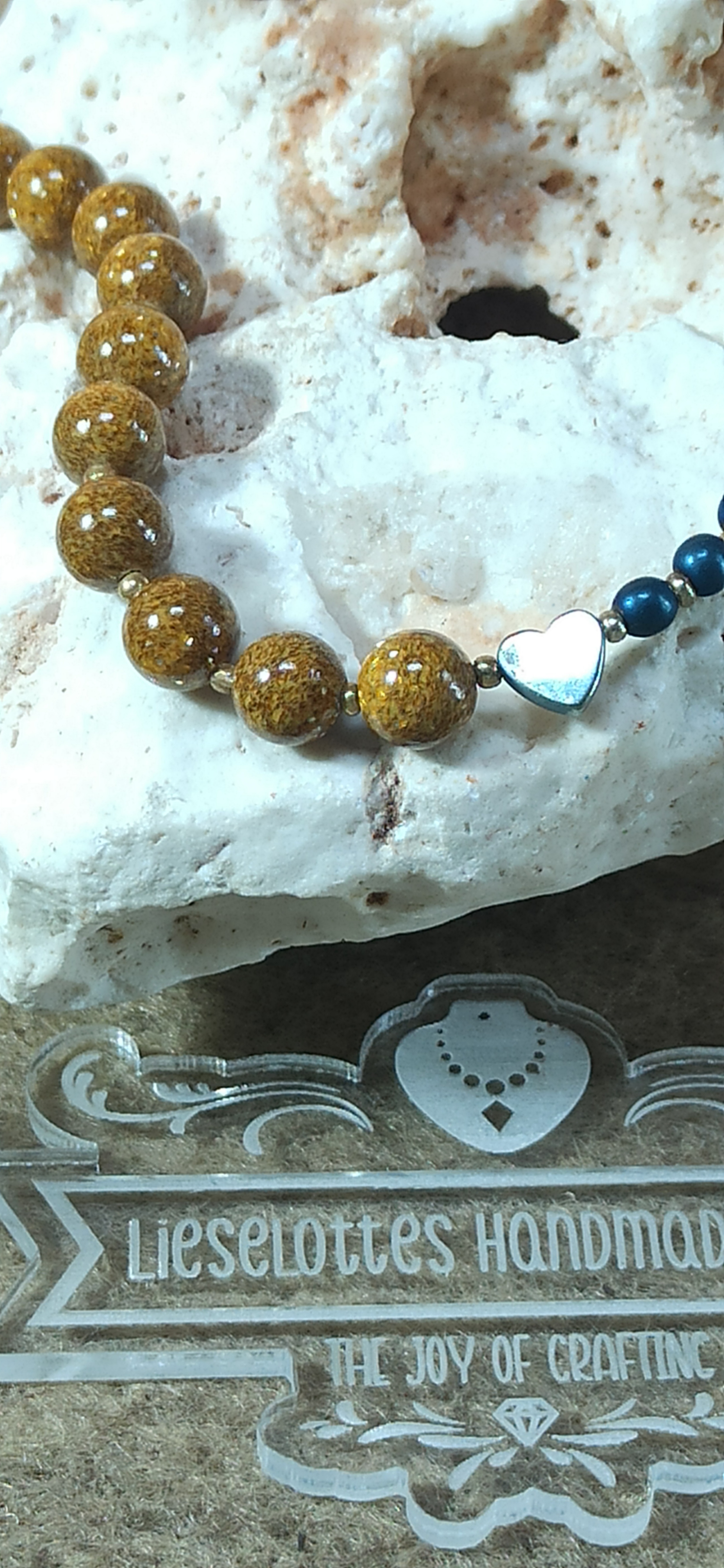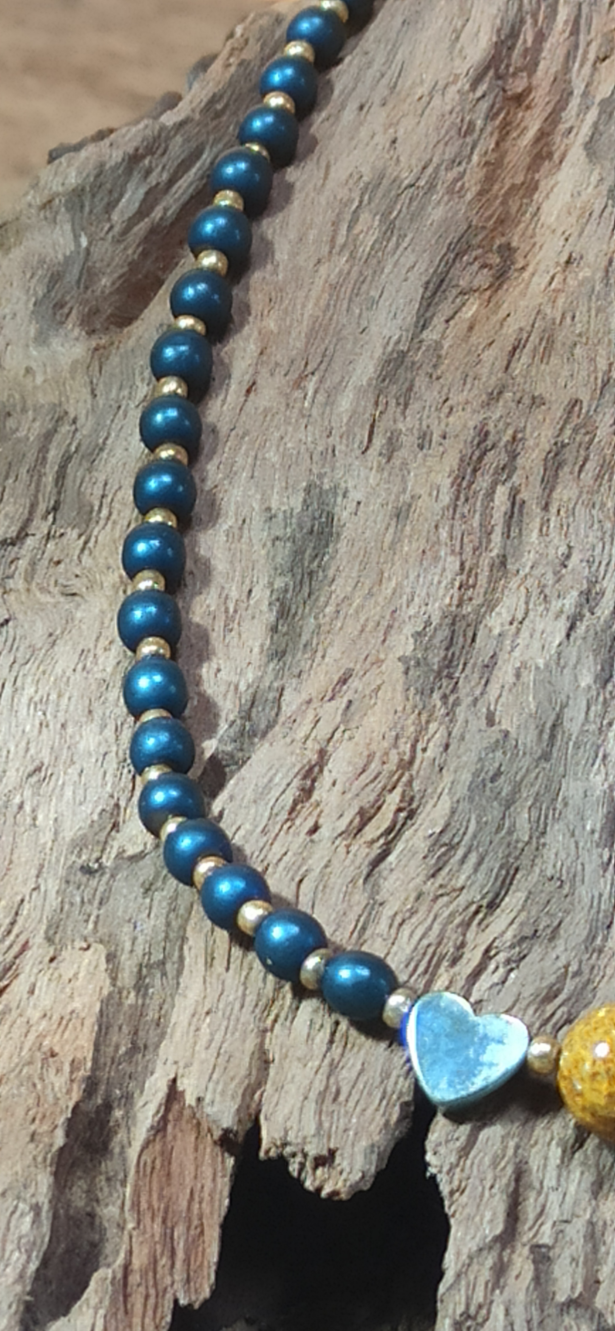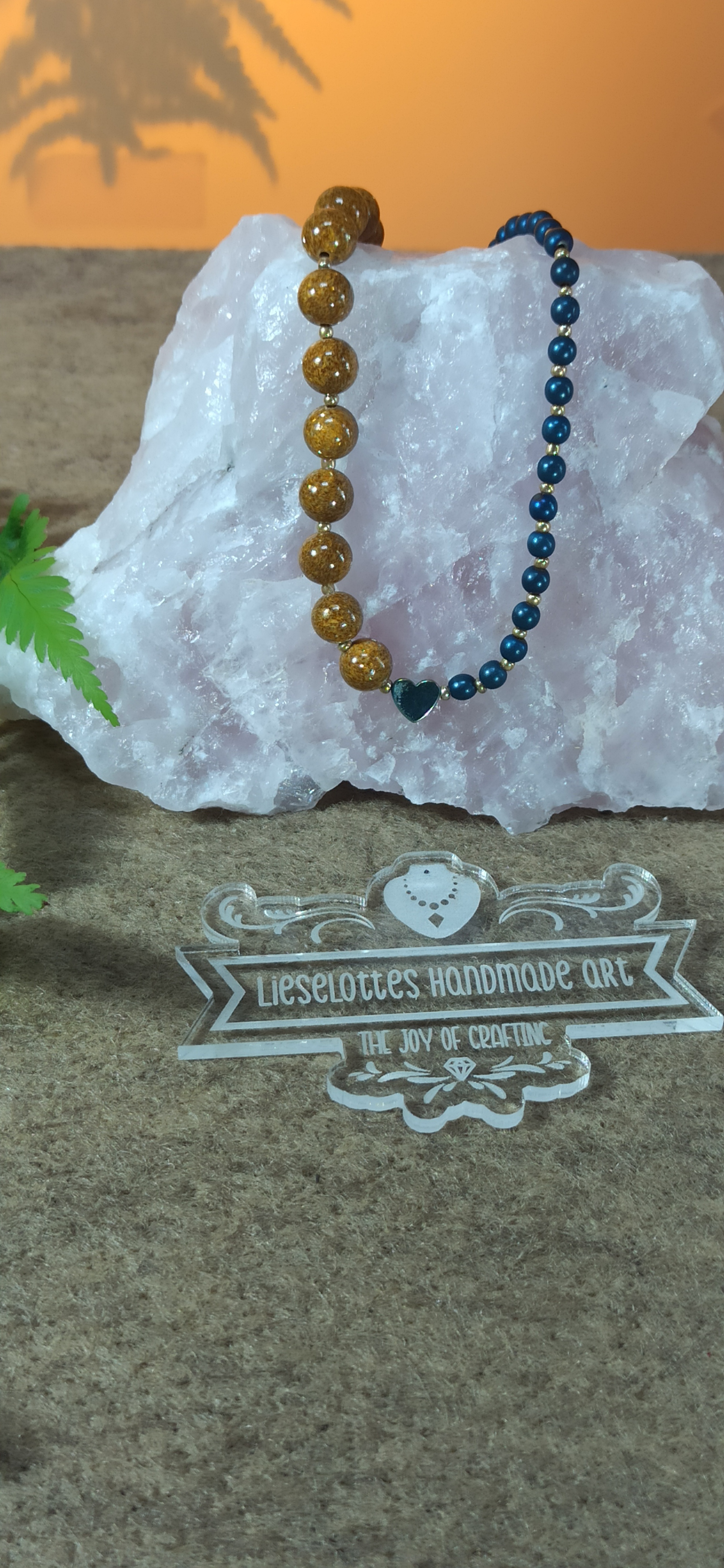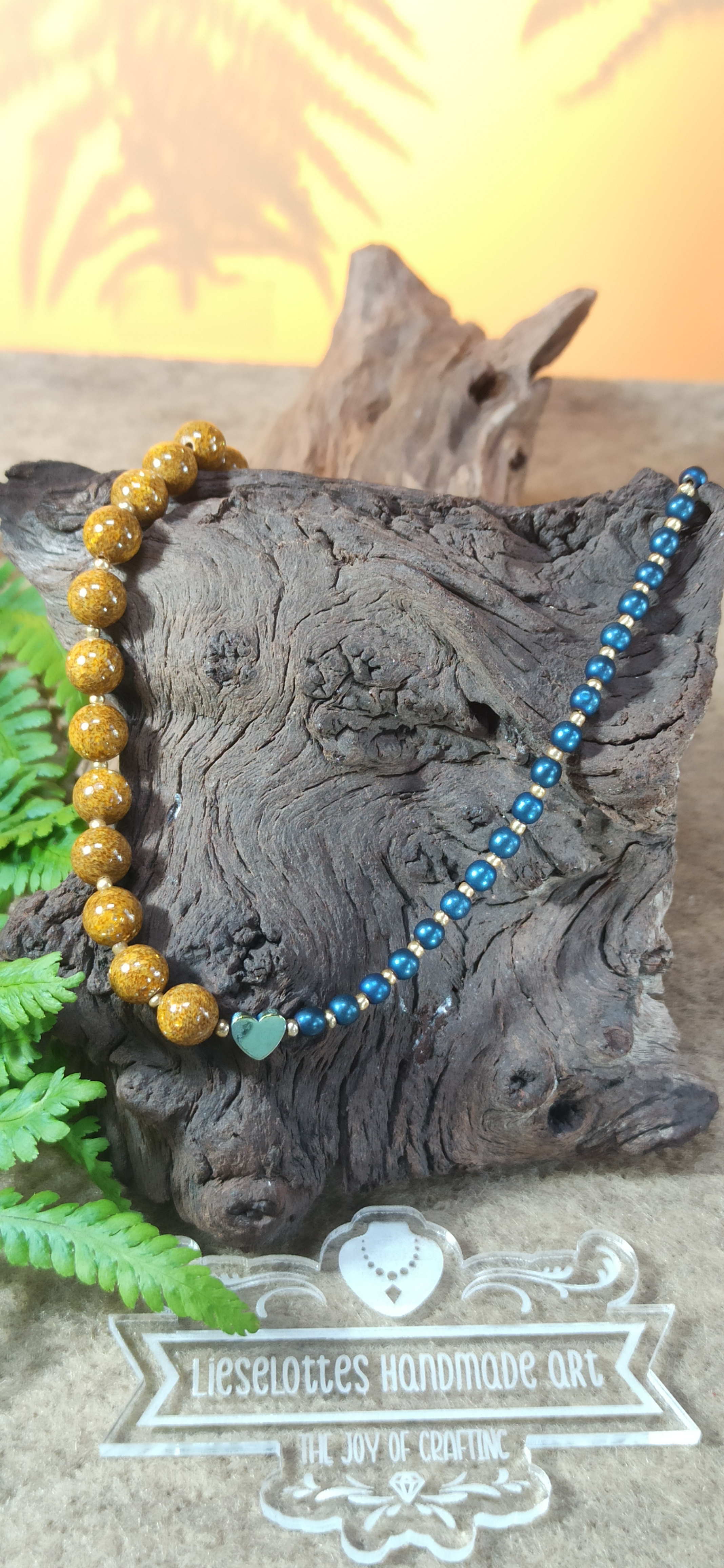 Mit ihrer atemberaubenden Kombination aus Glas-, echten Hämatit- und Jade-Perlen sowie einem Hämatitherz wird sie zum absoluten Blickfang: