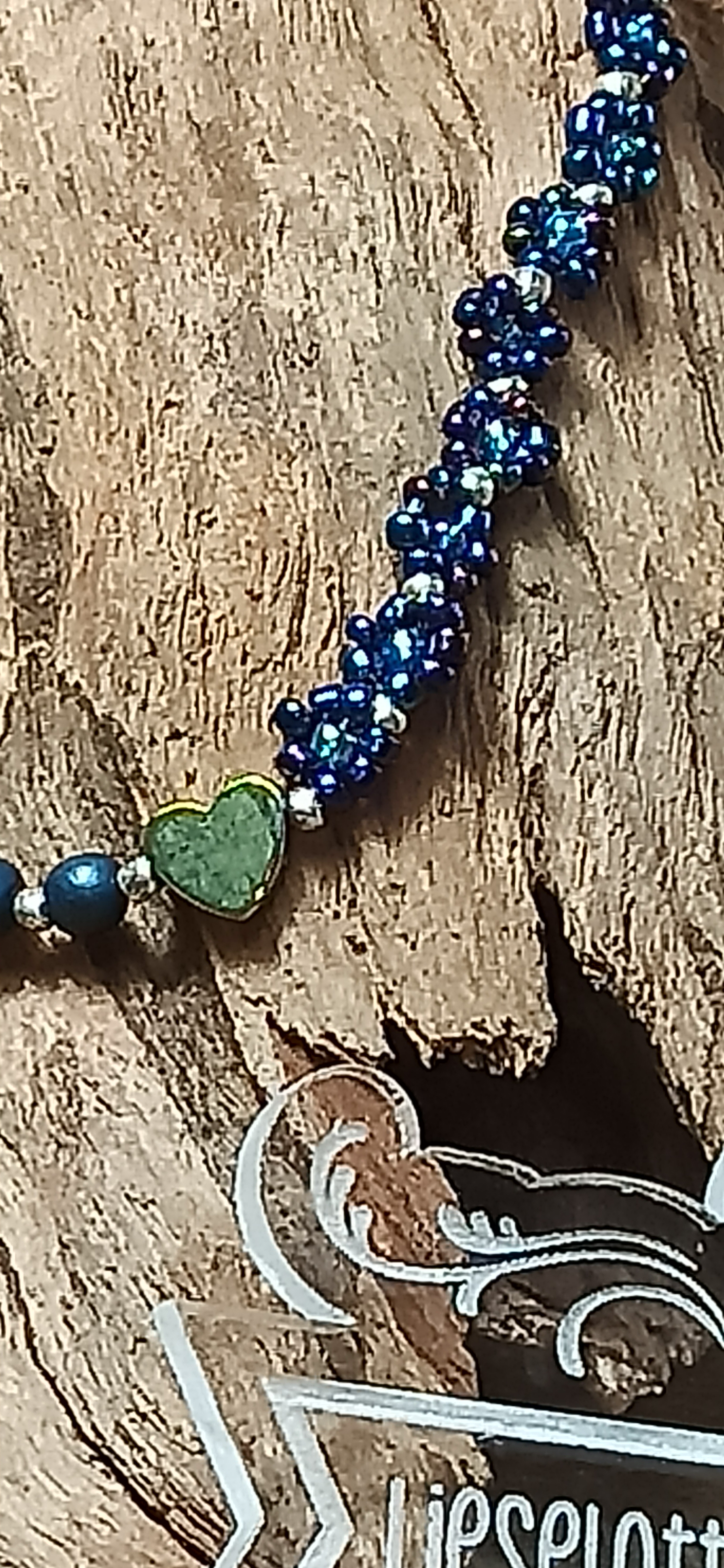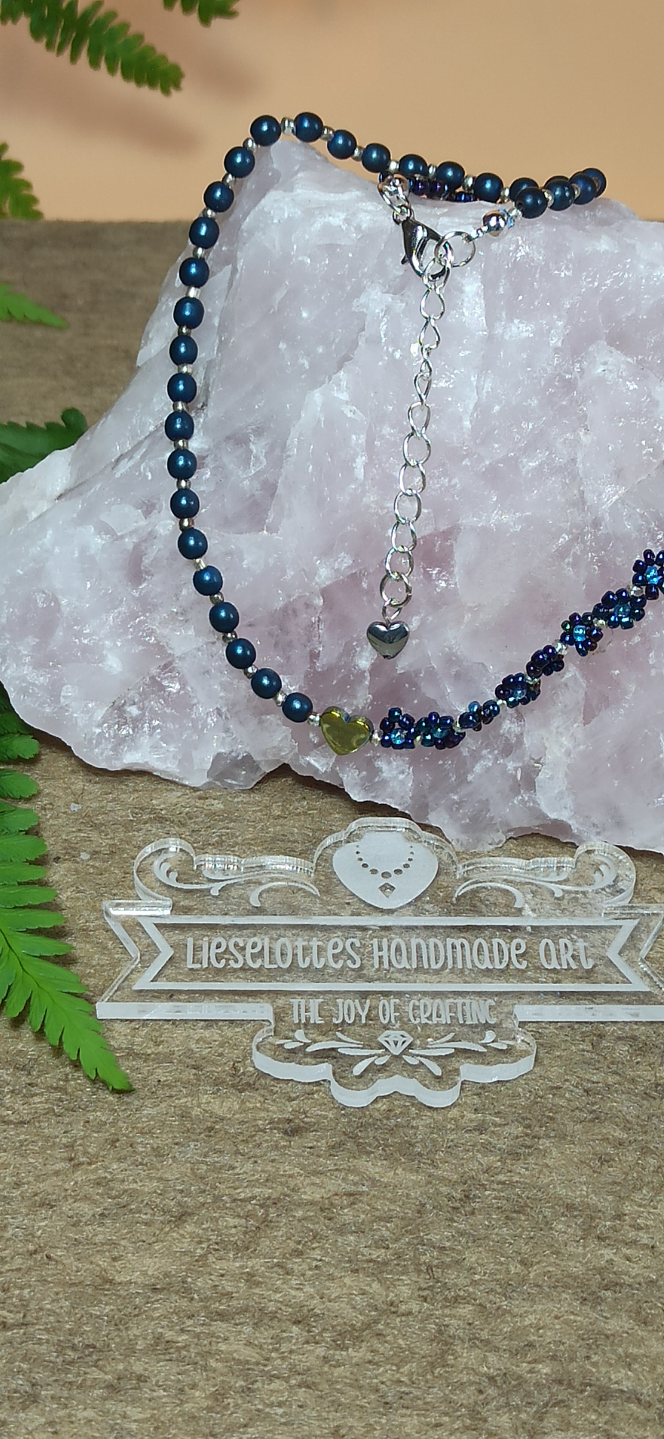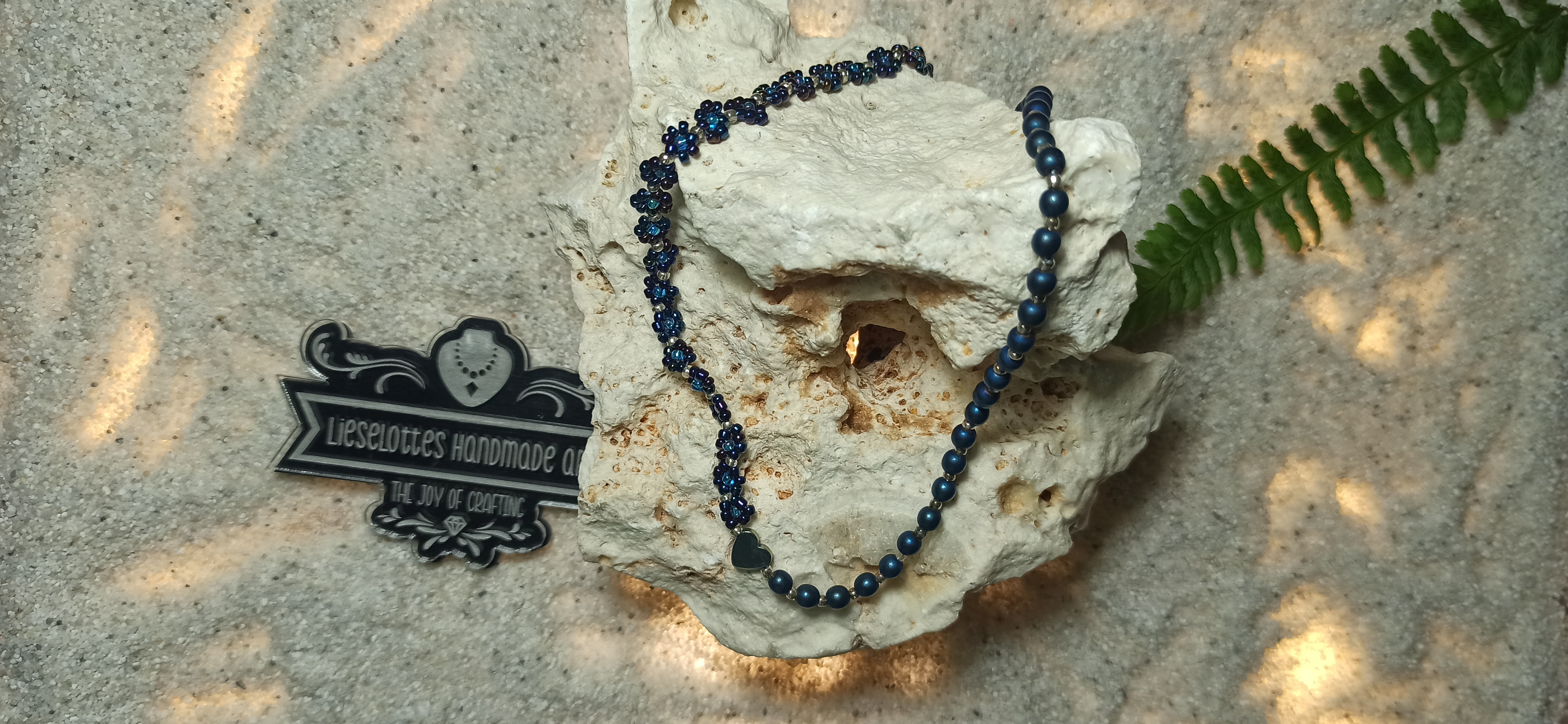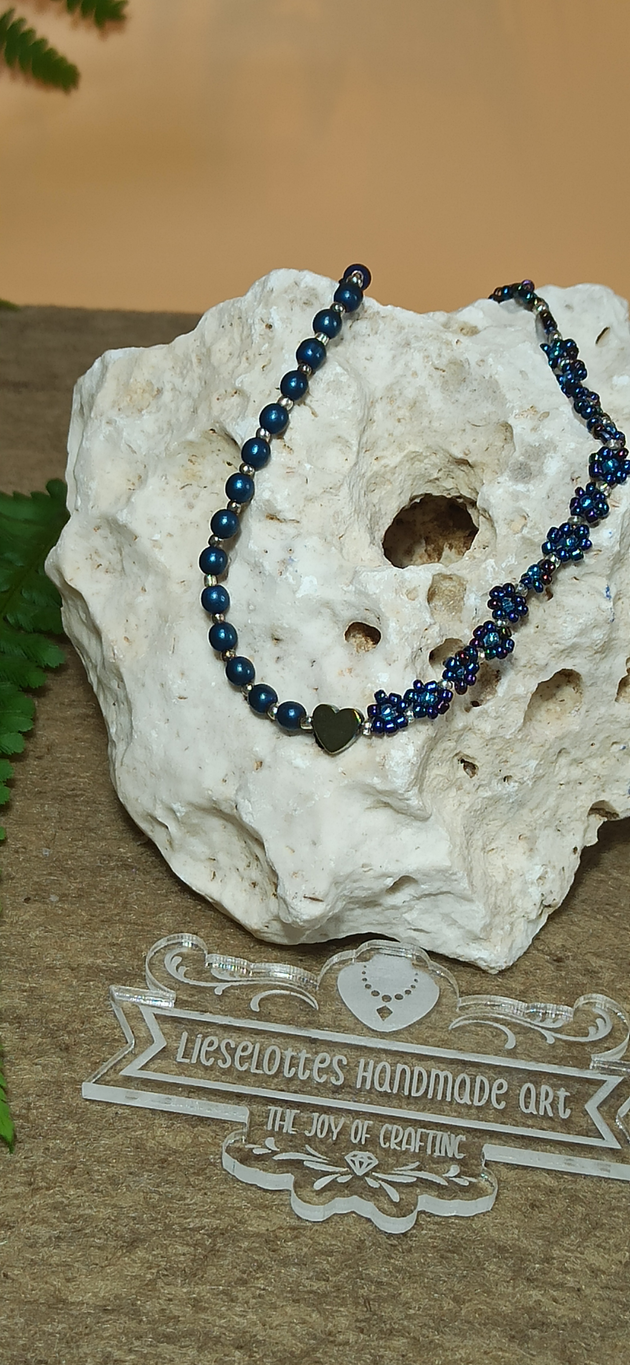 Mit ihrer atemberaubenden Kombination aus blauen Hämatitperlen, gold schimmerndem Hämatitherz und blau irisierenden Glasperlen im Blümchendesign wird sie zum absoluten Blickfang: