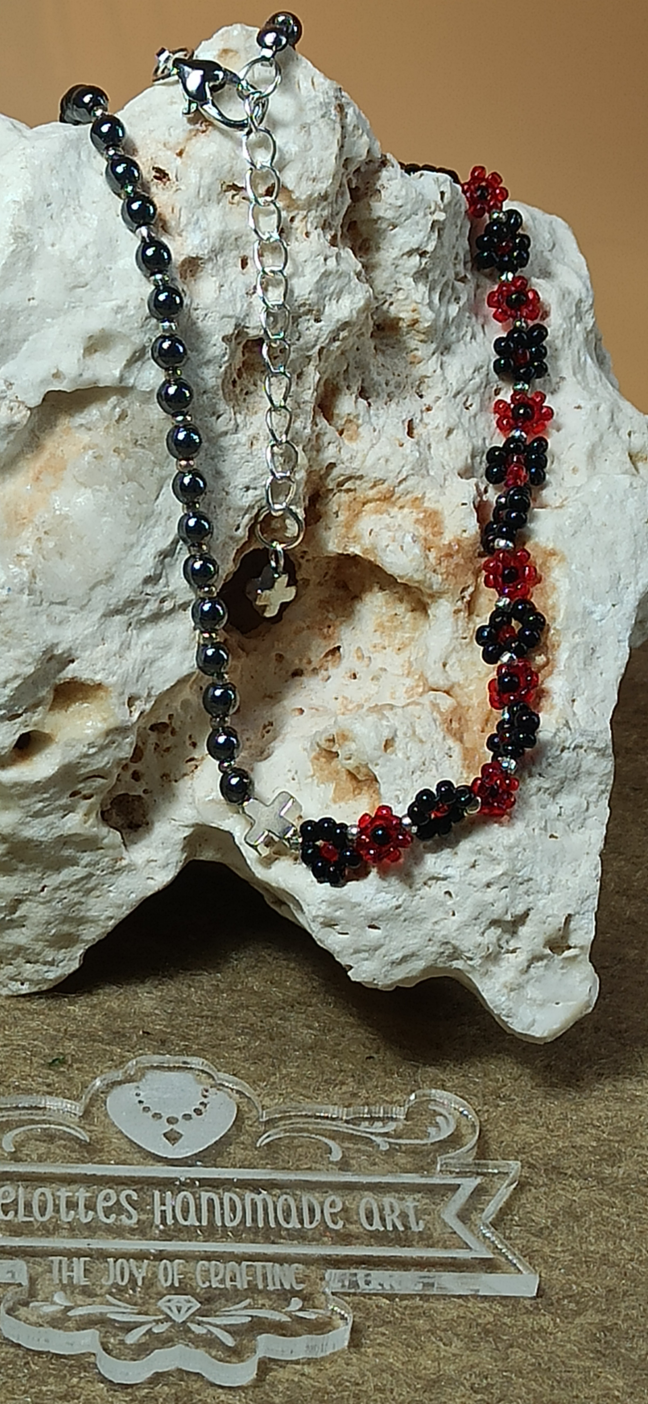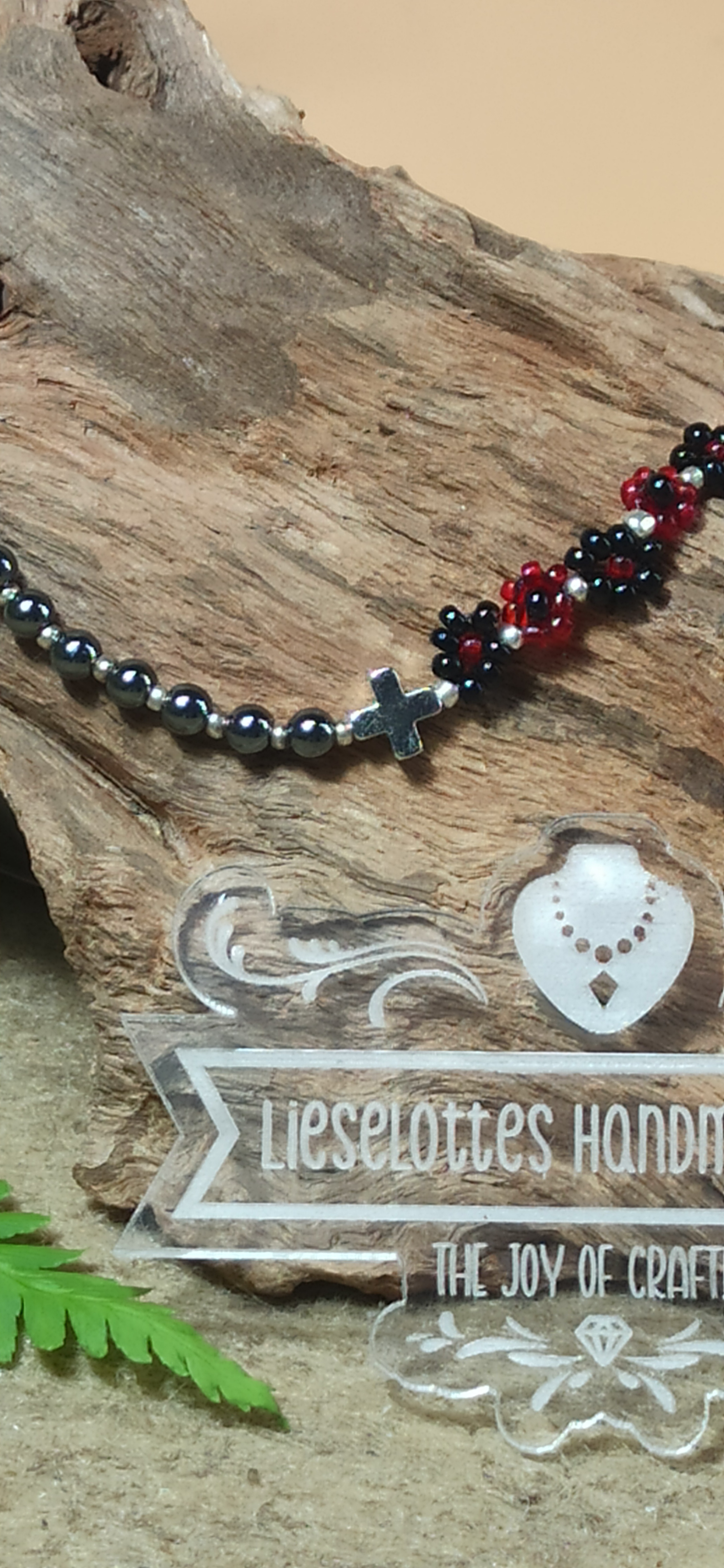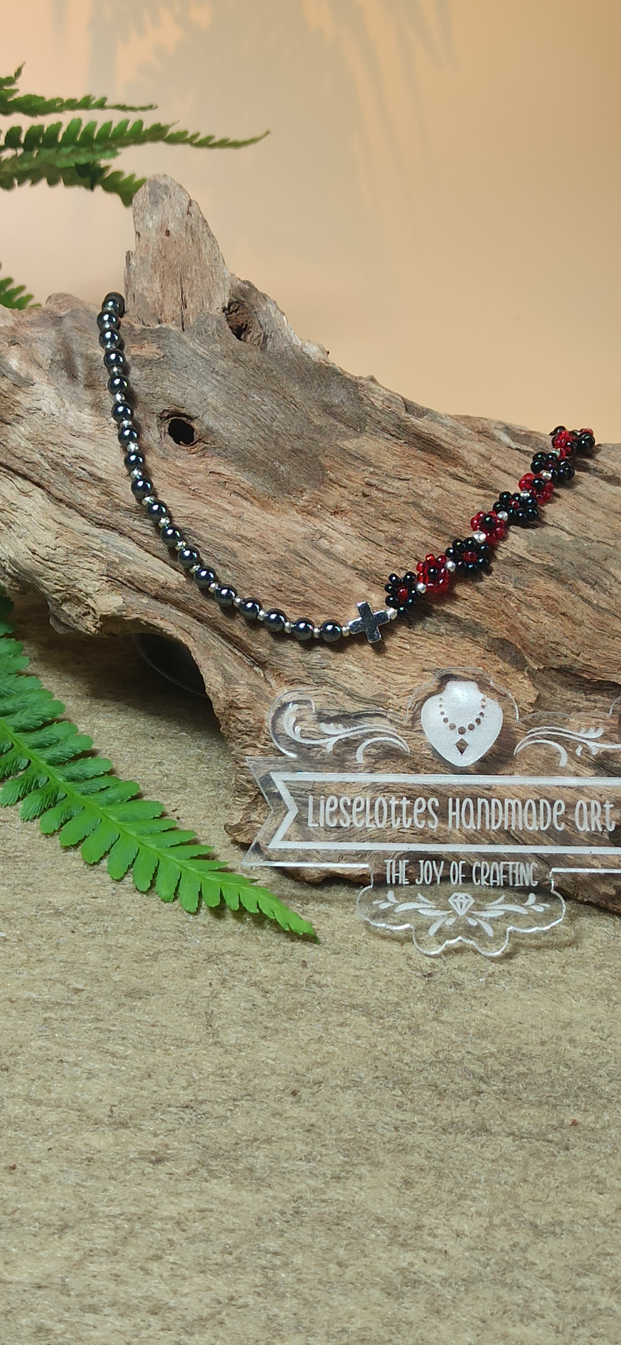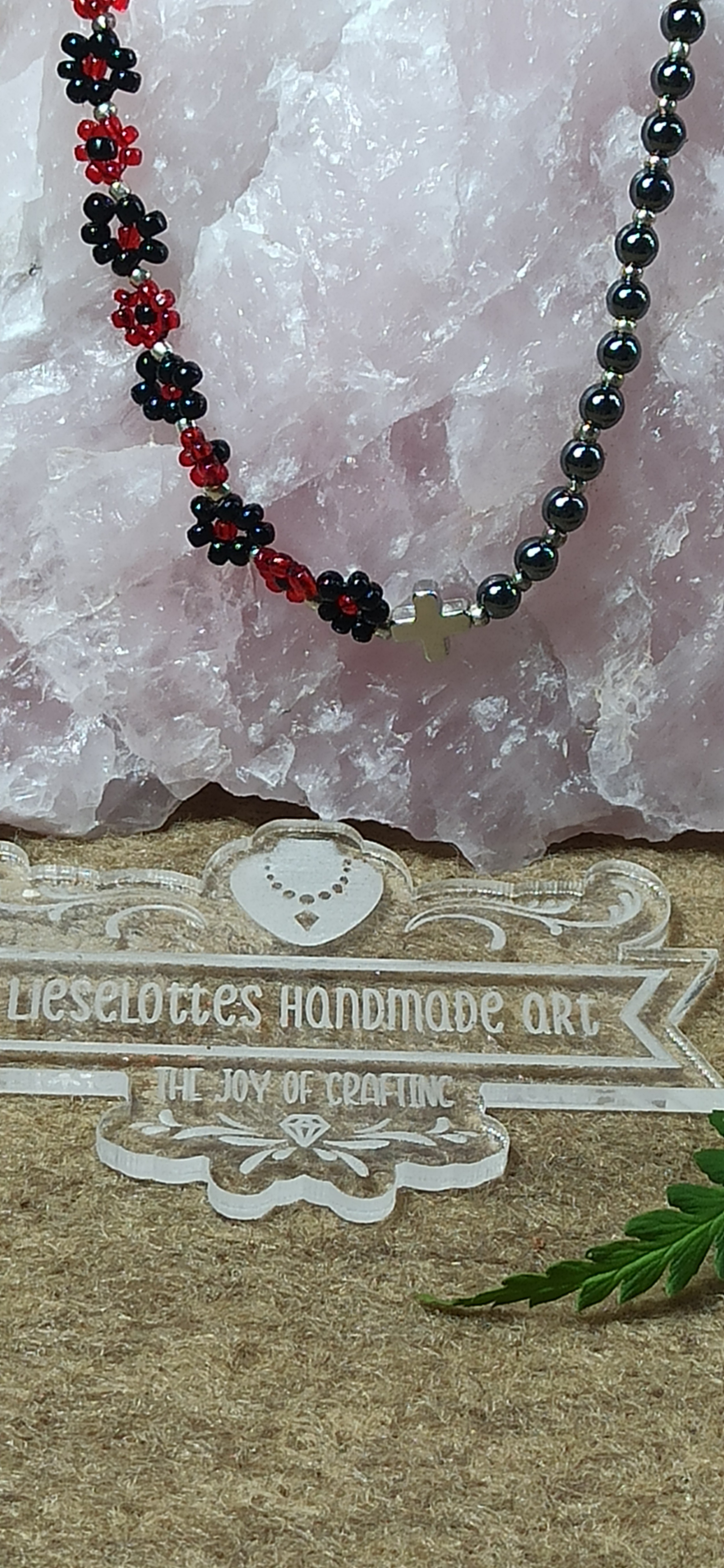 Startseite » Halsschmuck » Choker - Ketten » "Flower Power - Red Hope" - Glas- und echten Hämatit-Perlen (Unikat)