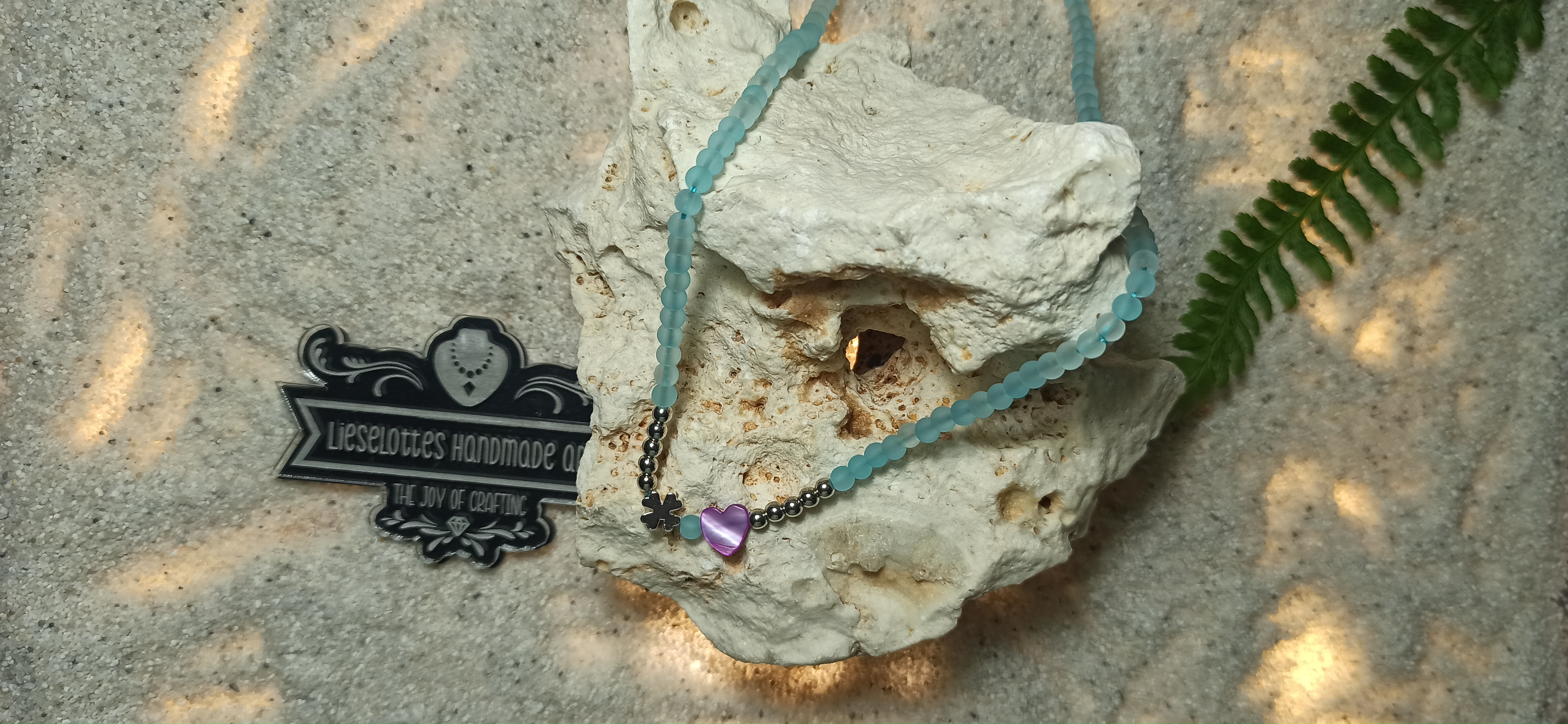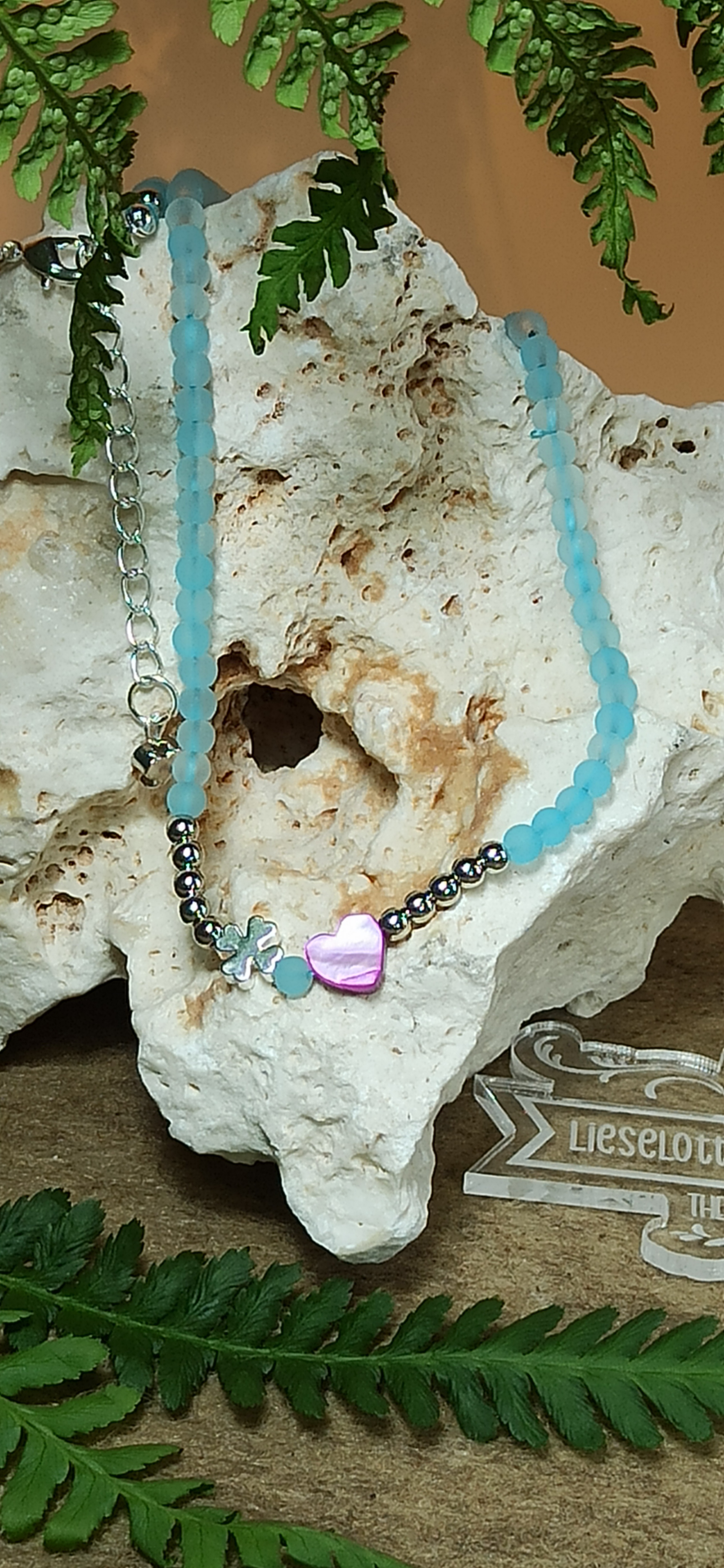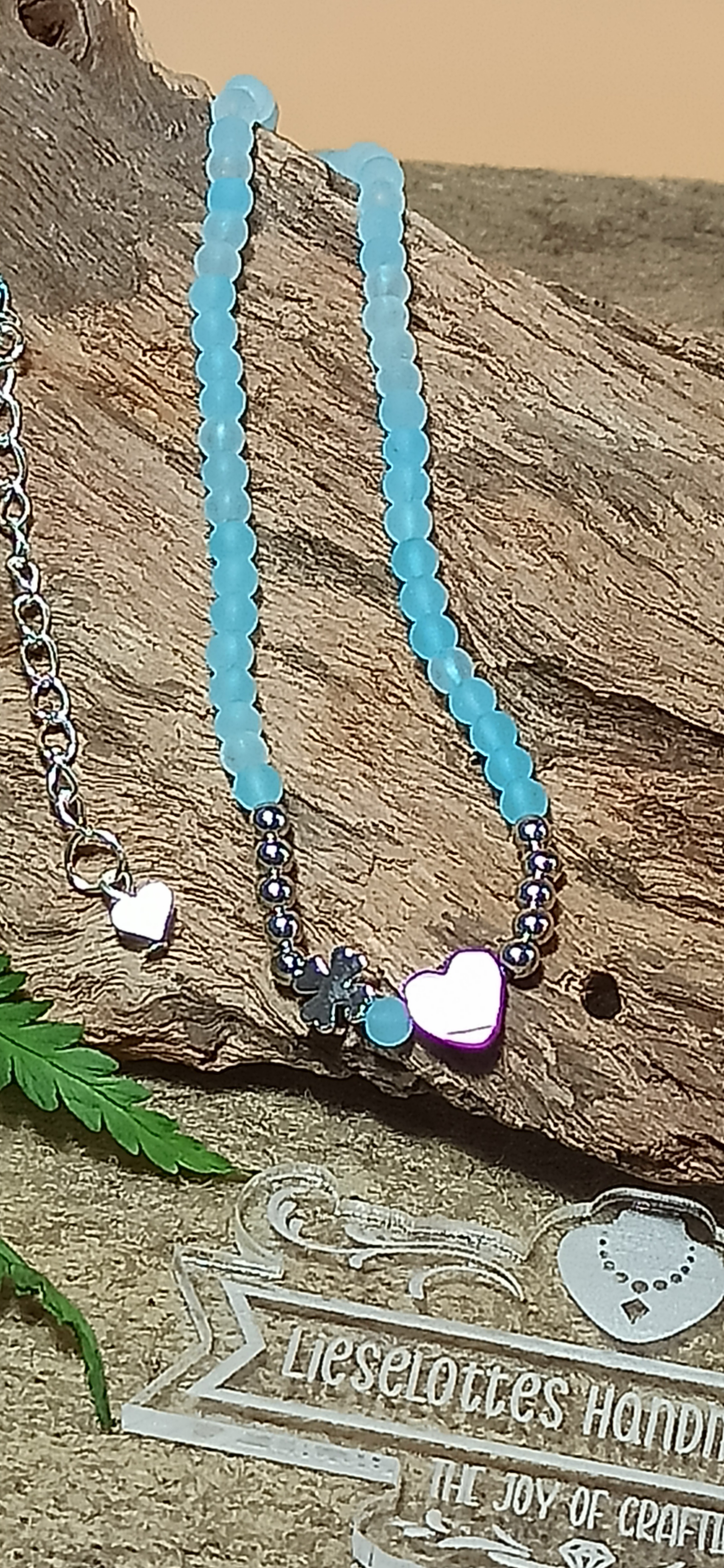 - hellblaue Glasperlen verleihen der Halskette etwas Geheimnisvolles
