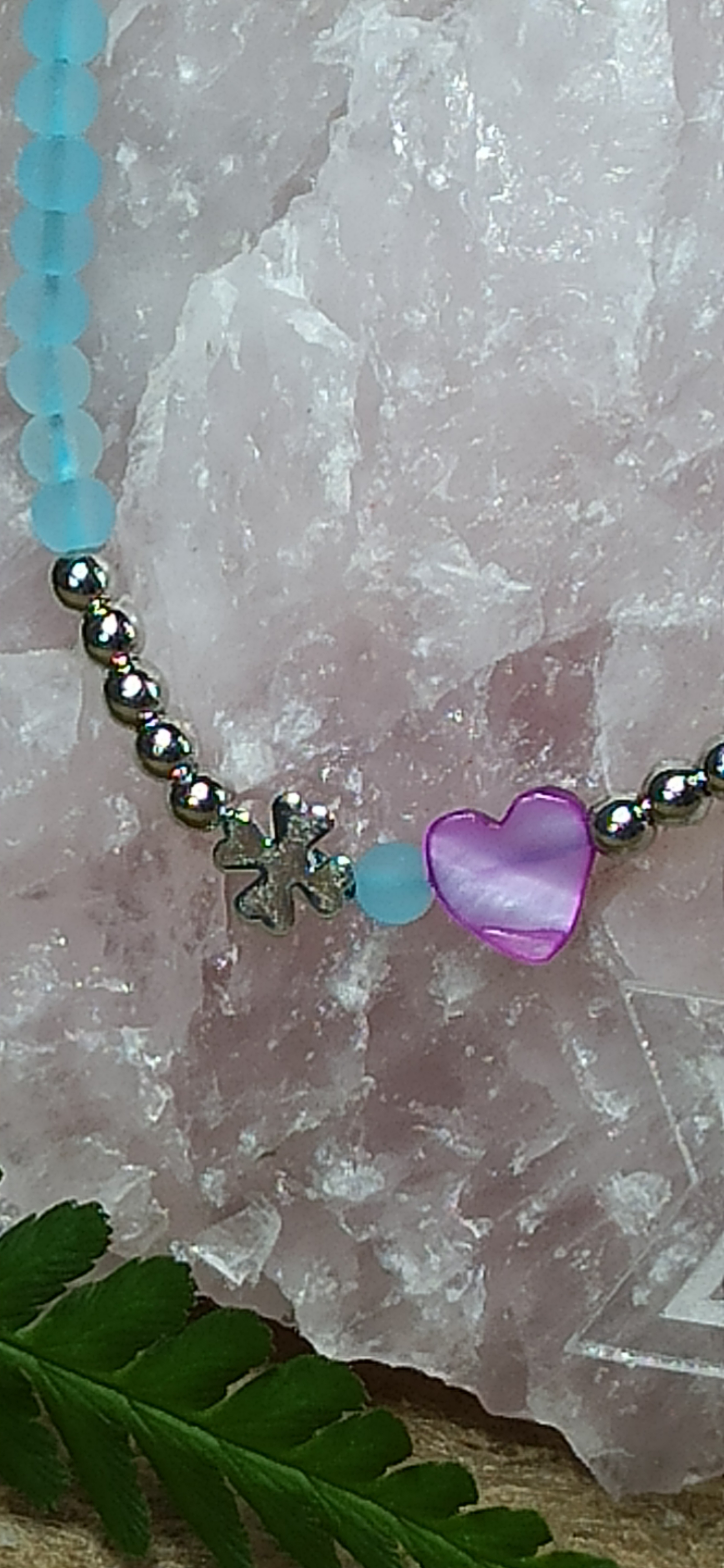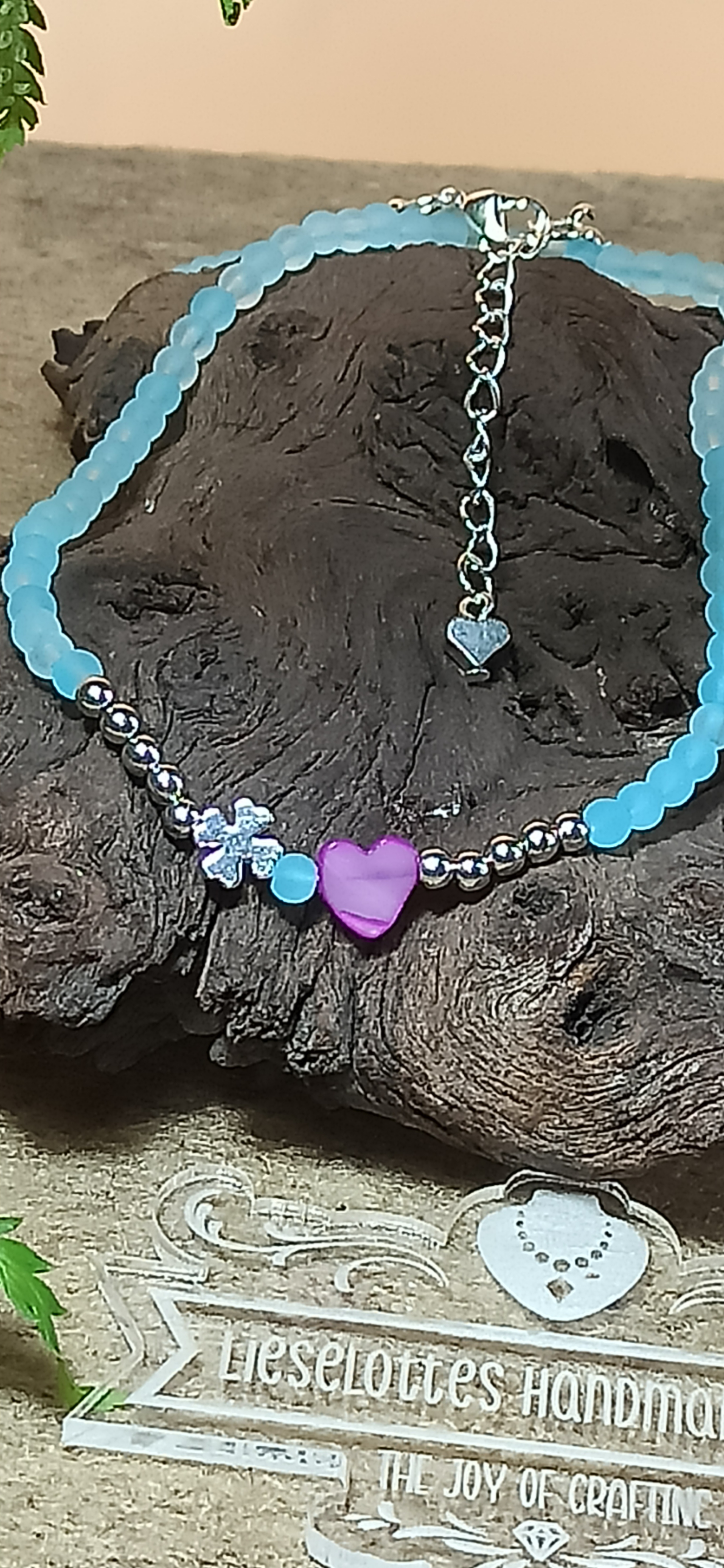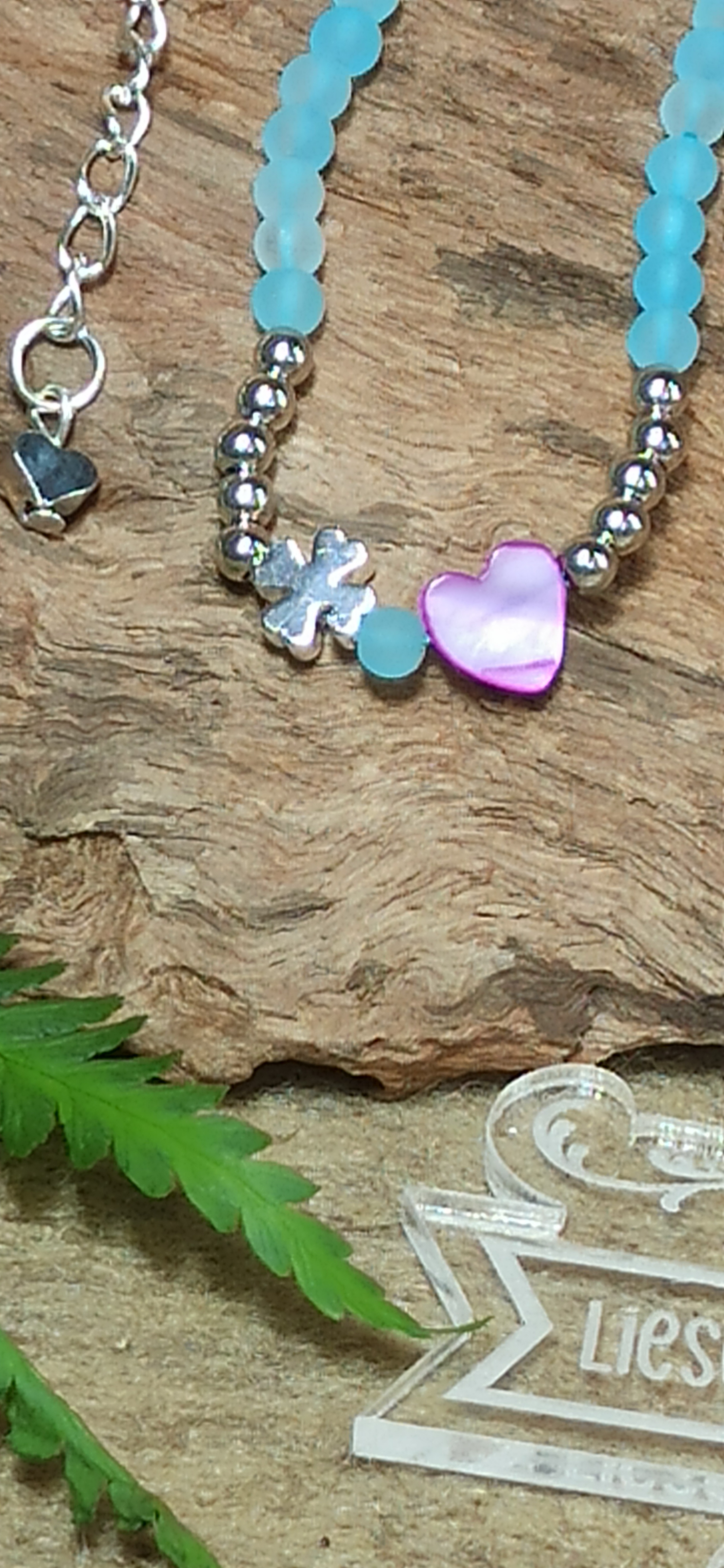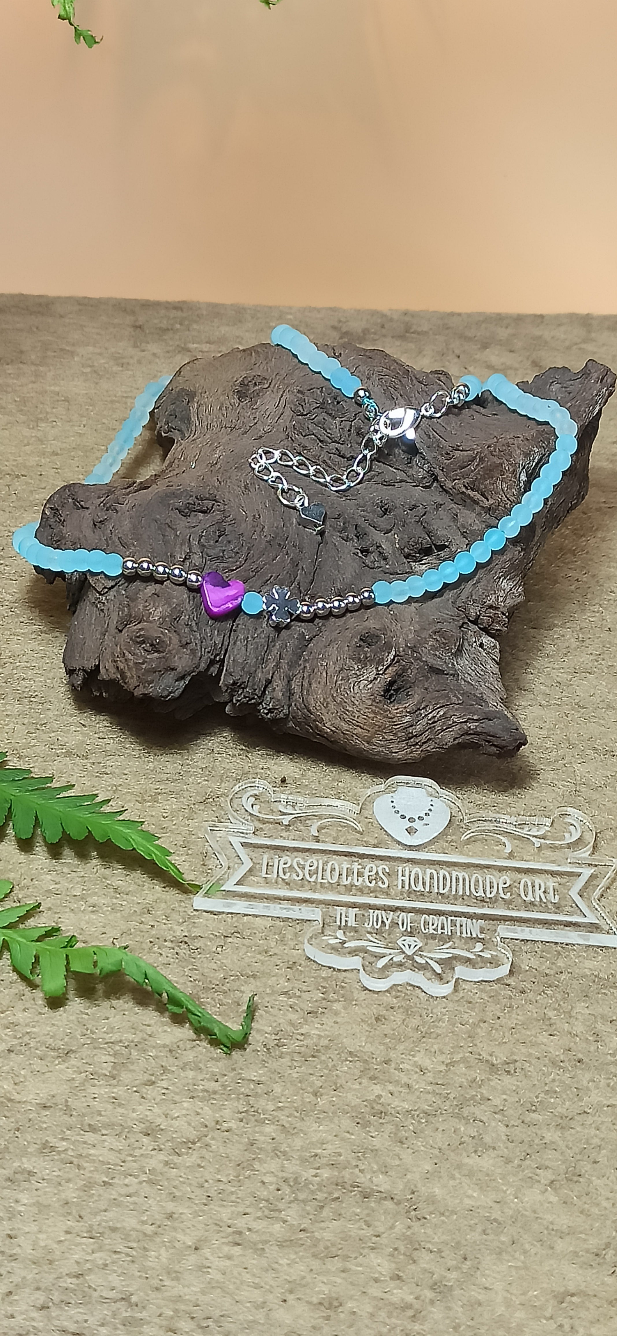 - hellblaue Glasperlen verleihen der Halskette etwas Geheimnisvolles