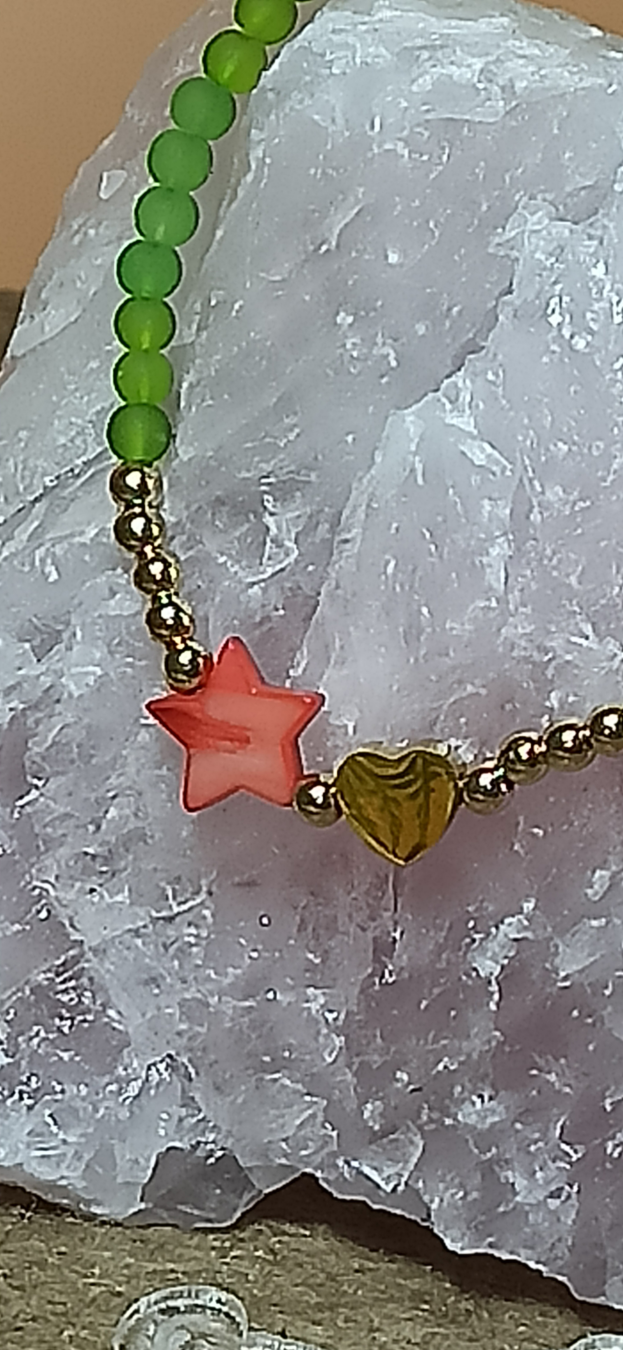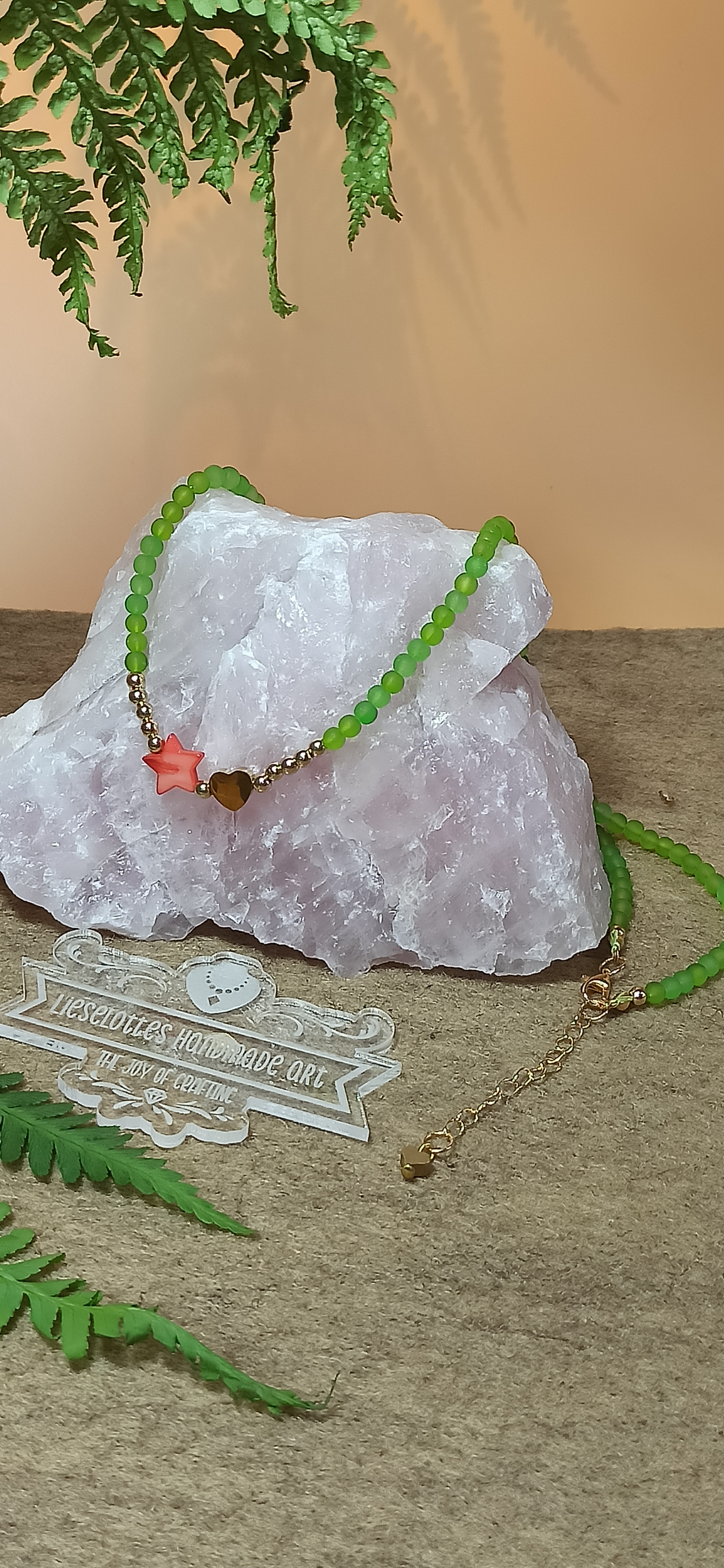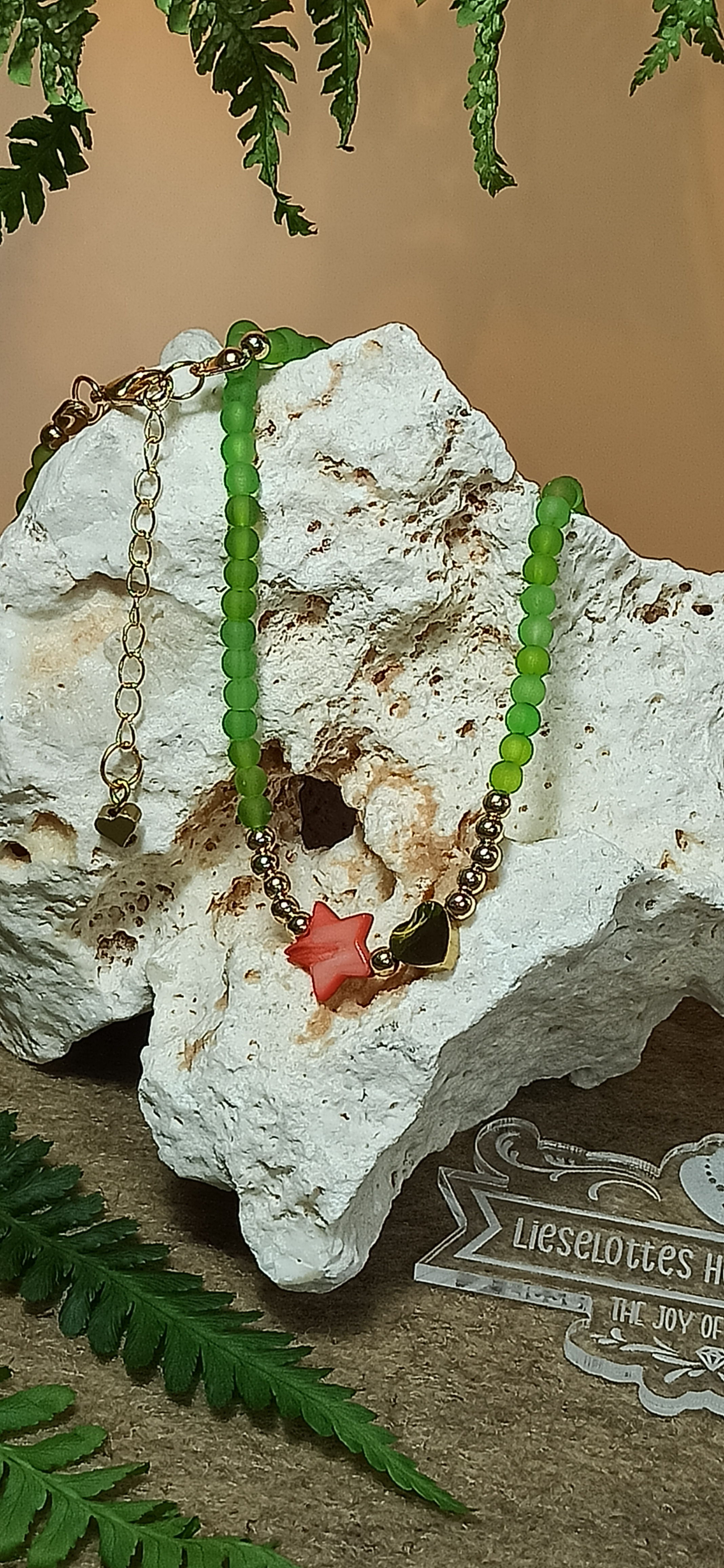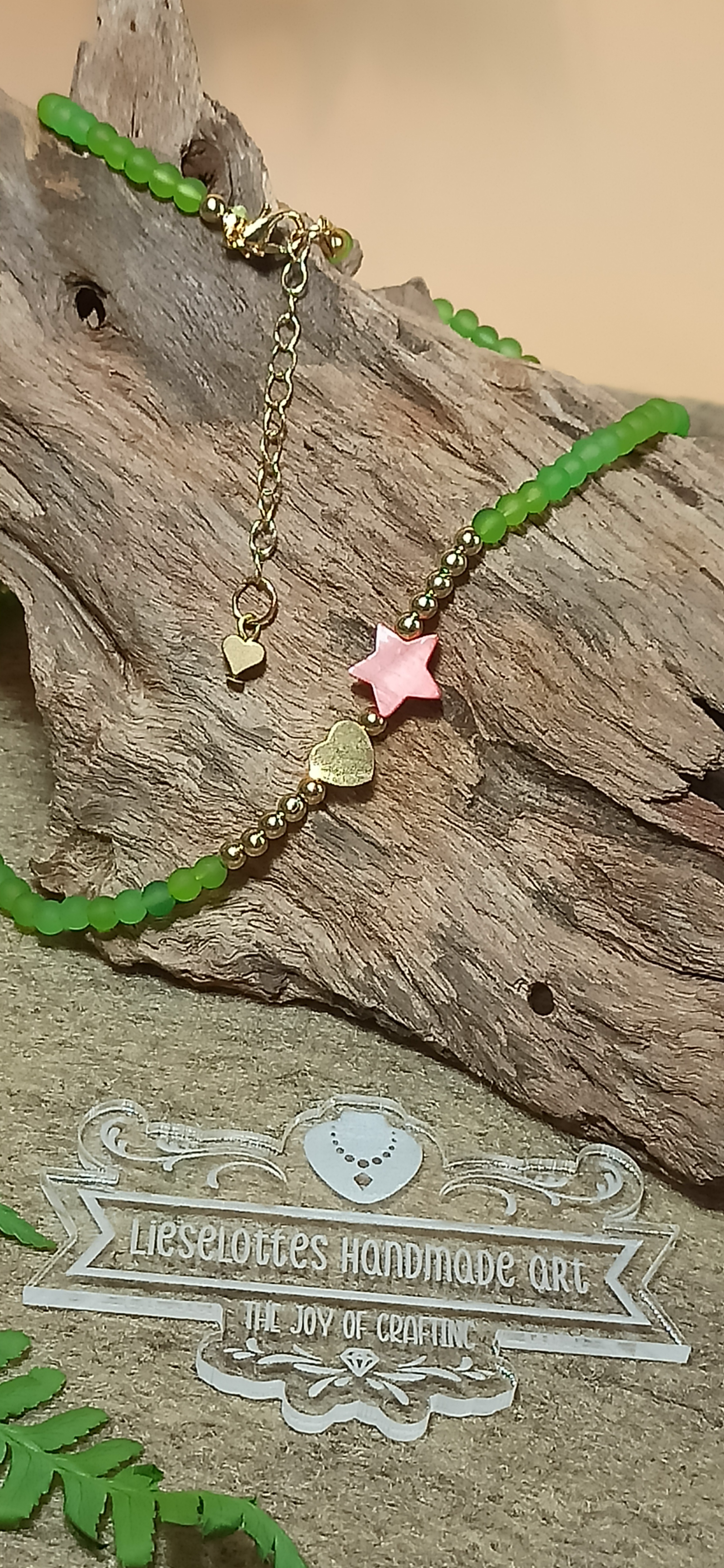 Mit ihrer atemberaubenden Kombination aus grünen Glasperlen, orange schimmerndem Perlmutt, hochwertigem, goldfarbenem Edelstahl und einem 18 Karat vergoldetem Herz wird sie zum absoluten Hingucker: